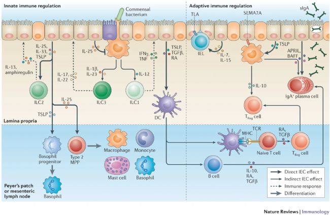 - IECs 向粘膜免疫細胞傳遞微生物信號,并促進針對普通細菌和腸道病原體的適當免疫反應的協調。抗原遞呈細胞和 IECs 之間的相互作用調節著作用于腸道屏障的 B 細胞和 T 細胞反應。