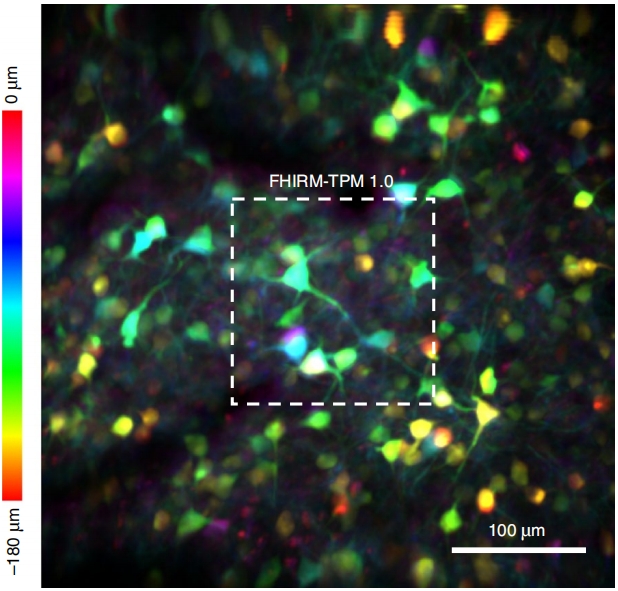 視頻3.(左)FHIRM-TPM 3.0高分辨探頭實現運動皮層的神經元(紅色)與神經元內線粒體的空間分布(綠)雙色成像重建;(右)FHIRM-TPM 3.0大視野探頭實現自由活動小鼠前額葉皮層450顆神經元的成像