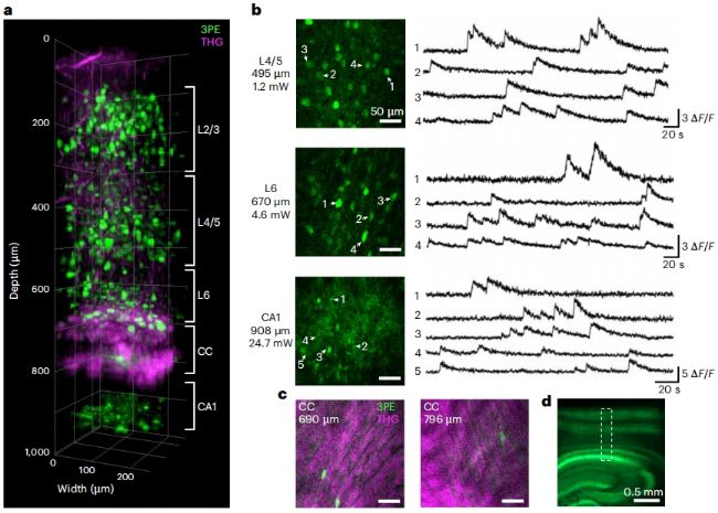 通過精密光學設計對全系統進行色差、球差校正,并優化光學系統設計,新一代系統在小鼠大腦皮層獲取到超過850微米深度的神經元鈣信號與結構成像,比此前的微型化雙光子顯微鏡成像深度提高了3倍多。