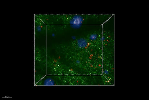 視頻1.阿爾茨海默癥模型小鼠神經元鈣信號(紅色)、線粒體鈣信號(綠色)與淀粉樣斑塊(藍色)的三維重建圖像