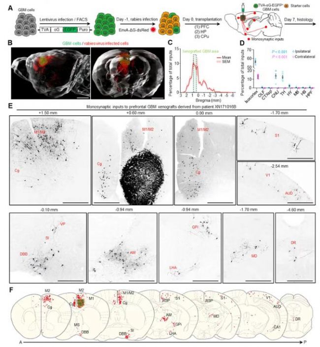 膠質母細胞瘤(GBM)作為最具侵襲性的原發性腦腫瘤,其進展高度依賴于中樞神經系統內的微環境。近年研究表明,GBM細胞能夠主動整合入神經環路,與神經元發生交互,從而促進自身增殖。然而,關于其全腦范圍的神經連接模式及不同神經遞質系統的遠距離調控機制,目前仍缺乏系統認識。在該項研究中,團隊首先借助偽狂犬病毒介導的逆行跨單突觸追蹤系統,利用