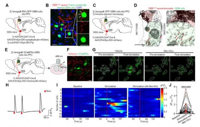 圖2:膠質瘤細胞與上游膽堿能神經元之間突觸連接及功能鑒定