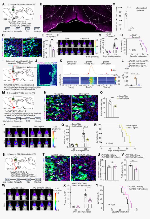 進一步地,研究者聚焦于膽堿能系統展開功能驗證。通過病毒工具特異性標記基底前腦斜帶核(DBB)中的ChAT陽性神經元,并在電鏡水平確認其與腫瘤細胞之間形成典型的突觸超微結構。利用光遺傳技術激活ChAT⁺神經末梢,利用