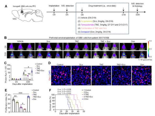 在轉化醫學方面,該研究提出“老藥新用”的治療策略:抗膽堿藥物東莨菪堿可有效抑制小鼠模型中GB的生長,并能增強替莫唑胺的化療敏感性;相反,常用的乙酰膽堿酯酶抑制劑(如多奈哌齊)則可能因提升膽堿能水平而加速腫瘤進展,提示臨床需謹慎評估該類藥物的使用風險。