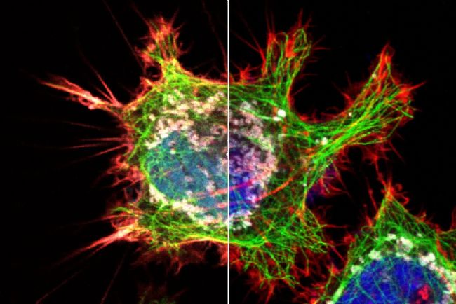 圖 3:HeLa 細胞(成纖維細胞);藍色:Dapi,細胞核;綠色:Alexa 488,微管;紅色:TRITC 鬼筆環肽,肌動蛋白;灰色:Mito Tracker Red CMXRos,線粒體。