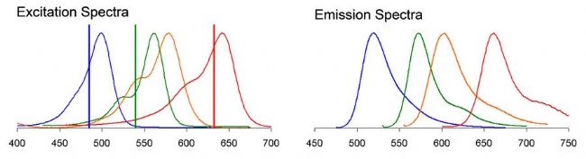 盡管光譜解混工具非常有用,但它們在樣本中解析熒光探針的能力有兩個主要限制。第一個限制是光譜解混受到系統中探測器數量的限制。換句話說,您無法解混超過系統能夠檢測的顏色。第二個主要限制是光譜解混算法無法區分相同顏色的熒光團,即那些具有相似發射光譜的熒光團。