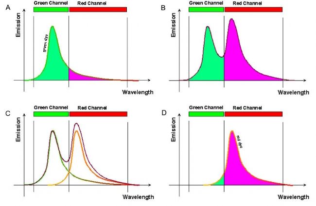為了說明串色如何影響實驗結果,圖 2(A)顯示了僅兩個熒光染料的典型激發曲線,一個綠色和一個紅色。如圖 B 所示,這兩種染料的相應發射曲線重疊。如果樣品中兩種染料的發射水平不可比,重疊的相對比例可能會更顯著(C)。當發射的光通過檢測器(在這個假設的情況下通過帶通濾光片)時,兩個熒光染料的信號都在紅色通道中被檢測到(D)。