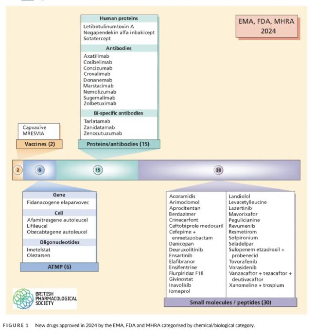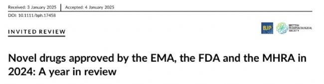 本文數(shù)據(jù)來源于《British Journal of Pharmacology》2025年4月綜述“Novel drugs approved by the EMA, the FDA and the MHRA in 2024: A year in review”。《British Journal of Pharmacology》:藥理學(xué)領(lǐng)域的“年度風(fēng)向標(biāo)”,創(chuàng)刊于1908年,專注于藥物作用機制、新藥發(fā)現(xiàn)及監(jiān)管科學(xué),最新影響因子為7.7(2023年)。其年度新藥綜述因覆蓋三大機構(gòu)、深度解析機制創(chuàng)新,已成為全球醫(yī)藥行業(yè)、監(jiān)管機構(gòu)及臨床醫(yī)生的“決策參考手冊”。