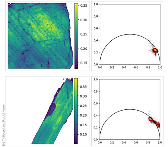 圖1:使用 FD(頻域)-FLIM 相機 pco.flim在示范裝置中對木材樣品進行測試。圖中展示了木材樣品的歸一化熒光(假彩色編碼)以及對應的相位圖(Phasor Plot)。相位圖顯示了不同的熒光壽命,由分類器進行判別。熒光信號區間約在 0.1–0.35,表明信號強度足夠。圖片來源:羅森海姆應用技術大學,M. Versen 教授。