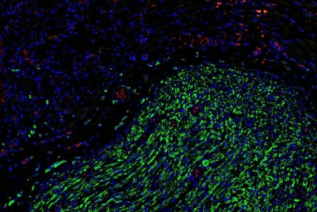 熒光顯微鏡下的組織切片,顯示成年大鼠趾長伸肌與腓總神經(jīng)之間的界面。2 周后的再生周圍神經(jīng)界面(RPNI)。使用 Mica 采集的圖像。細(xì)胞核(藍(lán)色)、神經(jīng)絲(綠色)和 S100B(紅色)染色。圖片由倫敦帝國學(xué)院生物工程系 Aaron Lee 博士(Rylie Green 博士實驗室)提供。