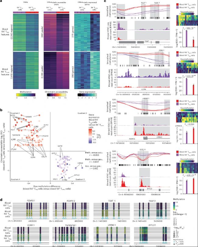 a. 血液CD45RA+ Treg細胞(RA+ Treg細胞)與血液CD45RA+ Tconv細胞(RA+ Tconv細胞)之間差異甲基化區域(左)、差異可及性peaks(中)和差異表達基因(右)的甲基化、染色質可及性和表達。