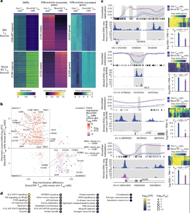 a. 皮膚Treg細胞與血液CD45RA+ Treg細胞(血液RA+ Treg細胞)之間差異甲基化區域(左)、差異可及性峰(中)和差異表達基因(右)的甲基化、染色質可及性和表達情況。