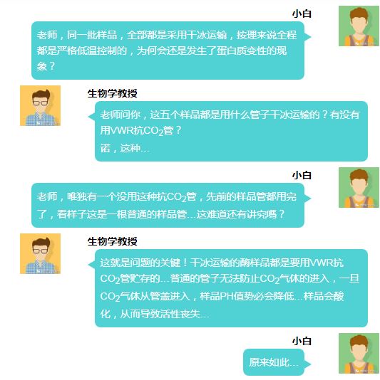 在上述案例中,酶的樣品被酸化,導致蛋白質(zhì)變性…小白忽略了干冰升華為CO2后會對普通樣品管貯存的酶的樣品溶液產(chǎn)生影響…通常,即便是短期貯存,樣品也可能會受CO2影響而被酸化。這種酸化會影響樣品的完整性和復性,并可能導致其活性的喪失。這種情況就要使用特殊的抗CO2管來貯存樣品