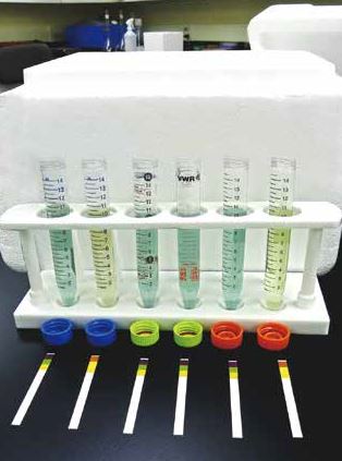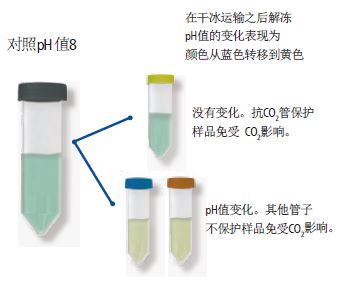 VWR抗CO2管能夠有效保護樣品不被酸化,其他的容器不能在干冰升華為CO2的過程保護樣品。碳酸的形成將導致pH值降低2.5pH單位。在這個實驗中, 酸化的表現(xiàn)是試劑顏色從藍色到黃色