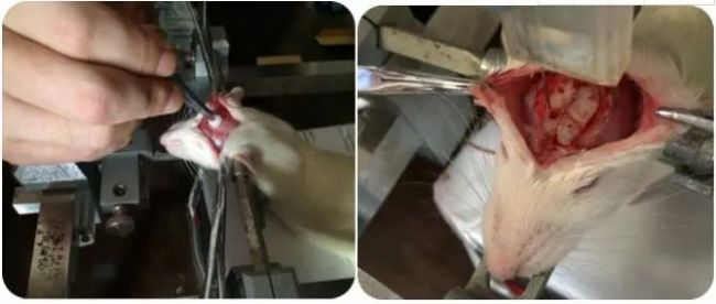 2. 剪去頭部的毛,用75%酒精棉球作頭部皮膚的消毒,沿矢狀縫作切口,剝離筋膜及肌肉,推開骨膜,并用3%雙氧水洗凈,用干棉球擦拭,暴露骨縫,止血。