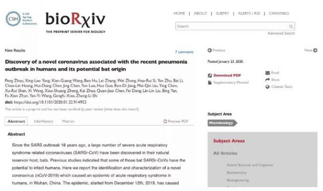 [2] Zhou P, et al. Discovery of a novel coronavirusassociated with the recent pneumonia outbreak in humans and its potential batorigin. bioRxiv, 2020. doi: https://doi.org/10.1101/2020.01.22.914952