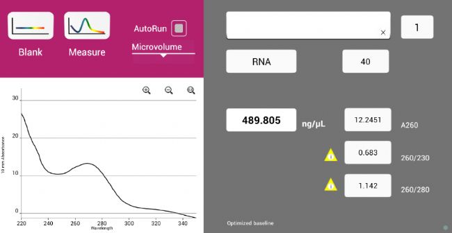 下圖為RNA紫外法檢測(cè)示意圖,A260/280和A260/230都不在正常的比值范圍,說(shuō)明RNA樣品純度很差,儀器會(huì)自動(dòng)進(jìn)行提示,兩個(gè)黃色小三角就是警示圖標(biāo)哦,點(diǎn)擊萌萌的黃色三角警示,儀器會(huì)顯示污染物的種類(lèi),夠智能吧,這就是DS-11特有的SmartQC功能