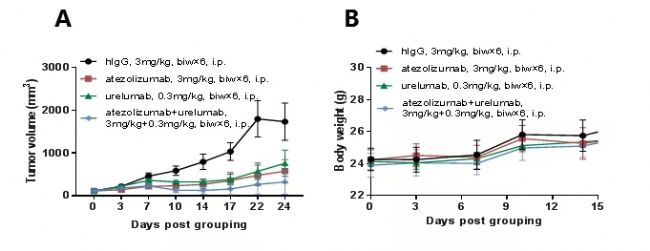 抗人PD-L1抗體(atezolizumab,內部)和抗人4-1BB(urelumab,內部)聯合給藥可有效控制 B-hPD-L1/h4-1BB 小鼠中的腫瘤生長,證明B-hPD-L1/h4-1BB小鼠為體內評價抗人PD-L1抗體和抗人4-1BB抗體組合提供了有力的臨床前模型。