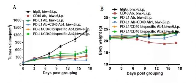 抗人CD40抗體和抗人PD-L1抗體聯合給藥顯示出比單獨給藥組更強的腫瘤抑制作用,證明B-hPD-L1/hCD40小鼠為體內評價hCD40抗體和hPD-L1抗體聯合治療的療效提供了有力的臨床前模型。