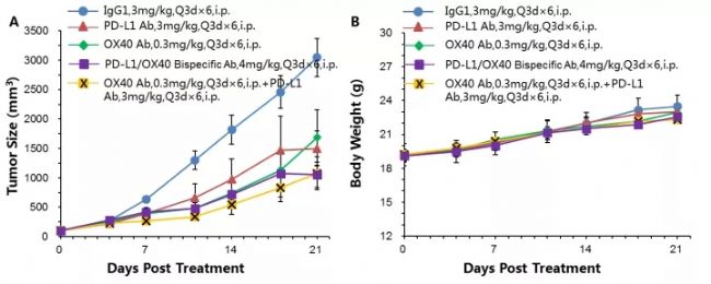 抗人OX40和抗人PD-L1抗體聯合給藥顯示出比單獨給藥組更強的腫瘤抑制作用,證明B-hPD-L1/hOX40小鼠為體內評價hOX40抗體和 hPD-L1抗體聯合治療的療效提供了有力的臨床前模型。