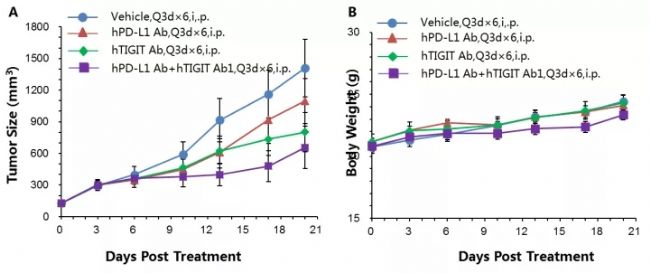 抗人TIGIT抗體聯合抗人PD-L1 抗體在B-hPD-L1/hTIGIT小鼠腫瘤模型中顯示出比單獨給藥組更強的抑制作用,證明B-hPD-L1/hTIGIT小鼠為體內評價hTIGIT抗體和hPD-L1抗體聯合治療的療效提供了有力的臨床前模型。