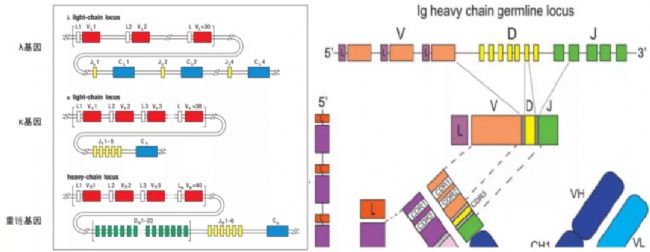 抗體的兩條鏈分別由不同的基因編碼。人類重鏈的基因位于14號(hào)染色體,由38 至 46 個(gè)功能性 VH片段、23個(gè)功能性 D 片段、6個(gè)功能性 JH 基因片段和9個(gè)CH片段構(gòu)成。人類抗體的輕鏈有κ和λ兩個(gè)亞型,分屬于兩個(gè)不同的基因。κ輕鏈基因位于 2 號(hào)染色體,含34-38個(gè)Vκ基因片段、5個(gè)Jκ基因片段和1個(gè)Cκ外顯子。人λ輕鏈基因位于22 號(hào)染色體,由29-33個(gè)功能Vλ基因片段和4個(gè)Jλ基因片段組成。在B細(xì)胞成熟過程中抗體輕重鏈V(D)J基因片段會(huì)發(fā)生RAG1/2重組酶介導(dǎo)的重組,其結(jié)果是一個(gè)抗體重鏈包含一個(gè)V (VH)、一個(gè)D 和一個(gè) J (JH)基因,與此重鏈配對(duì)的輕鏈包含一個(gè)V(VL) 和一個(gè) J (JL),這種重組是完全隨機(jī)的。這種輕重鏈基因的隨機(jī)重組配對(duì)產(chǎn)生了106以上的多樣性。