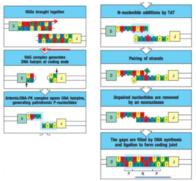 由于抗體基因的重組過程中發(fā)生基因大片段的刪除和拼接,在此DNA修復(fù)過程中發(fā)生了P核苷酸添加、N核苷酸添加和核酸外切酶活性刪除。P或回文核苷酸添加是由重組早期形成的發(fā)夾結(jié)構(gòu)末端開放產(chǎn)生的,可在一段末端增加多達(dá)4個(gè)核苷酸。這種添加的頻率在不同的片段末端和根據(jù)重排的基因片段而不同。N核苷酸添加是通過脫氧核苷酸轉(zhuǎn)移酶末端 (TdT)在重鏈重排的VHD和DJH連接處以及在較小程度上在輕鏈的 VL和JL連接處隨機(jī)添加核苷酸。N核苷酸加成對(duì)延長(zhǎng)CDR3的長(zhǎng)度、增加CDR3序列和構(gòu)象多樣性具有重要意義。此外核酸外切酶活性可從重組元件的編碼末端去除多達(dá)15個(gè)核苷酸。這種V(D)J連接處核苷酸的增加或刪減在一定程度上大大增加了抗體序列的多樣性。
