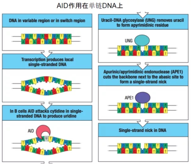 通過抗體基因片段重組及非同源末端修復(fù),機(jī)體建立了多樣性高達(dá)107級(jí)的抗體表達(dá)庫,這足以確保對(duì)環(huán)境中遇到的絕大多數(shù)抗原的應(yīng)答,但這個(gè)庫尚不足以產(chǎn)生高親和力抗體。B 細(xì)胞成熟過程中會(huì)發(fā)生一些有意思的事情。通常,在人體細(xì)胞中DNA整體突變率非常低,每個(gè)DNA復(fù)制周期中1億個(gè)堿基中僅大約有一個(gè)會(huì)發(fā)生突變。然而在次級(jí)淋巴結(jié)生發(fā)中心B細(xì)胞被抗原反復(fù)的激活與增值循環(huán)過程,B細(xì)胞會(huì)表達(dá)一種突變酶AID,它專門誘導(dǎo)DNA中U:G錯(cuò)配的產(chǎn)生進(jìn)而產(chǎn)生點(diǎn)突變,或者使DNA雙鏈斷裂產(chǎn)生小片段的插入或缺失,導(dǎo)致體細(xì)胞突變 (SM)在抗體V區(qū)的一些高變熱點(diǎn)成為高頻事件,突變發(fā)生率每代每堿基對(duì)高達(dá)10-3,造成抗體基因進(jìn)一步多樣化,這個(gè)現(xiàn)象被稱為體細(xì)胞高突變。體細(xì)胞高突變有3種可能的結(jié)果,即抗體分子與其同源抗原的親和力保持不變,或者增加,或者降低。突變后具有更高親和力BCR的B細(xì)胞相比低親和力BCR抗體的B細(xì)胞更易受到刺激。也正因如此,體細(xì)胞高突變的結(jié)果是產(chǎn)生了更多的B細(xì)胞,這些B細(xì)胞的BCR 對(duì)其同源抗原具有高親和力。有效的結(jié)果是為了使成熟的B細(xì)胞可以繼續(xù)增殖,它們必須結(jié)合于其同源抗原而不斷被重新刺激。這樣的結(jié)果是選擇出了具有對(duì)同源抗原具有較高親和力受體的 B 細(xì)胞,這個(gè)過程稱之為親和力突變。這些經(jīng)歷親和力選擇,表達(dá)高親和力BCR的成熟B細(xì)胞分化為漿細(xì)胞后將持續(xù)分泌高親和力抗體。