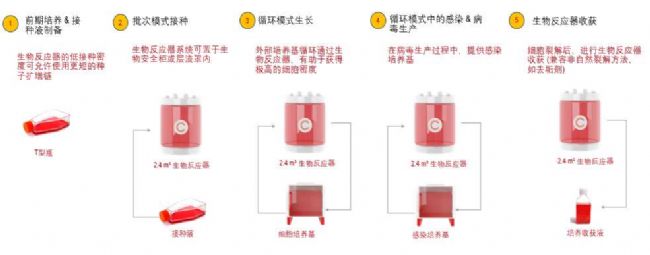 7 TCID50/mL,說明,由于相比微載體系統(tǒng),細(xì)胞被更緊實(shí)地填充在固定床中,從而可能可使病毒在該空間內(nèi)更容易地貼附到細(xì)胞,所以獲得了更快的反應(yīng)動(dòng)力學(xué)。此外,在感染后的前4小時(shí),固定床單元和培養(yǎng)基瓶之間的培養(yǎng)液循環(huán)暫停。相比微載體生物反應(yīng)器,在該段時(shí)間內(nèi),病毒的單位體積濃度可提高2.8倍。