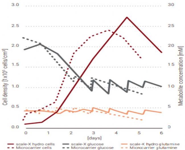 圖4: scale-X™ hydro生物反應(yīng)器和標(biāo)準(zhǔn)微載體培養(yǎng)中的Vero細(xì)胞生長