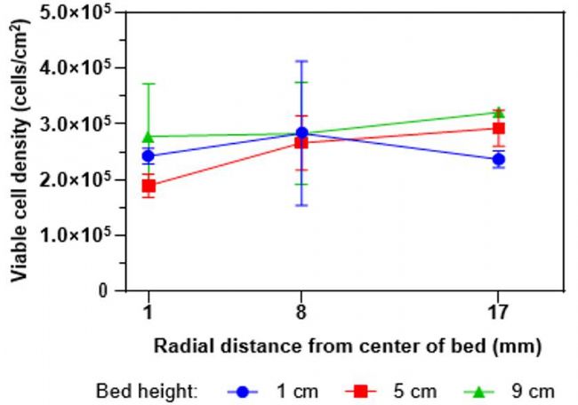 scale-X™ hydro固定床生物反應(yīng)器可生產(chǎn)與微載體運(yùn)行相似的感染性滴度,但達(dá)到的生產(chǎn)時(shí)間更短。此外,固定床生物反應(yīng)器生產(chǎn)rVSV-ZEBOV的病毒基因組和感染性滴度比例更低,而感染性病毒顆粒的細(xì)胞特異性產(chǎn)率更高?傮w結(jié)果顯示,當(dāng)工藝轉(zhuǎn)移至固定床scale-X™生物反應(yīng)器時(shí),可獲得相似的細(xì)胞生長趨勢和最高單位面積細(xì)胞濃度。最后,對Vero細(xì)胞生長分布的研究顯示,固定床內(nèi)有均勻的細(xì)胞貼附和生長。相比微載體工藝,固定床的緊湊設(shè)計(jì)可使設(shè)備占地降低5倍。