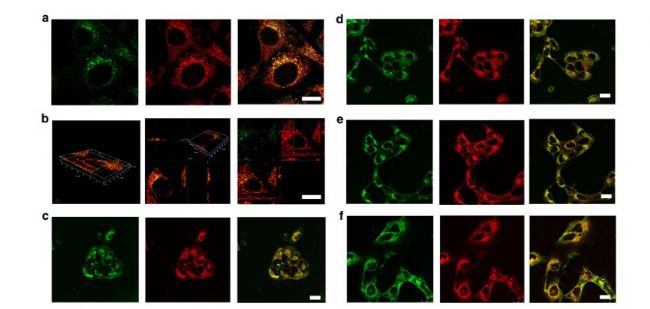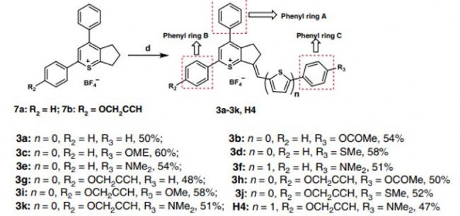 本文作者以硫吡喃鹽雜環作為電子接受體,開發出了一系列新型的具有D-A結構的近紅外探針。它們的結構分別如圖所示,其中,3f和H4具有最大的吸收和發射紅移波長,最可能的原因是它們在D和A單元之間有很強的電荷轉移結構。研究人員隨后利用他們具有上轉換發光的特點,進行了線粒體共定位實驗,他們將3k和H4分別接上水溶性側鏈PEG,并且在H4-PEG的基礎上再接上靶向骨肉瘤細胞的寡肽PT,最終三個探針3k-PEG、H4-PEG和H4-PEG-PT都具有線粒體靶向性,證明了硫吡喃在線粒體近紅外成像上的巨大應用前景。