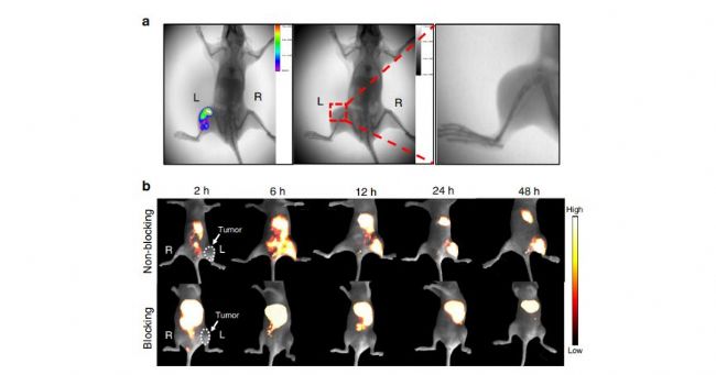 隨后,研究人員將H4-PEG-PT靜脈注射(200µg,200µL)到143B荷瘤小鼠體內。從NIR-II成像圖可以得出結論,143B腫瘤在6到48小時內從周圍背景組織中清晰可見,其信噪比在12h時達到4.57±0.15。而阻斷組各時間點熒光信號均較正常組低。