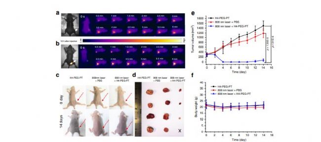 最后,研究人員進一步探究了該近紅外探針的診療效果。H4-PEG-PT被靜脈注射進入143B小鼠。注射12h后,利用808nm的激光照射腫瘤部位8min(1.5 W/cm2),腫瘤表面溫度由33.0℃快速升到66.7℃,證明H4-PEG-PT將光能轉換為了熱能,從而對腫瘤起到殺傷效果。