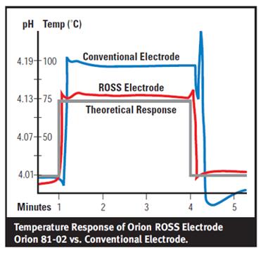 傳統電極和ROSS電極都從25℃,pH 4.01的標準緩沖液中取出后立即測量75℃,pH 4.13的溶液。ROSS電極在30秒左右的時間里讀數趨于穩定,而傳統電極需要4分鐘的時間。隨后回測原標準緩沖液,ROSS電極讀數迅速恢復,而傳統電極依然需要數分鐘的時間。 |