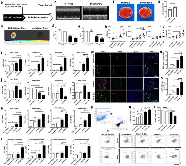 巨噬細胞極化在IR誘導的心臟損傷和修復中起重要作用。因此研究人員試圖確定IR-EVs是否調節巨噬細胞極化。結果顯示,IR-EVs顯著增強IR損傷心臟中M1極化標記基因NOS2和促炎細胞因子IL1β、IL6和TNFα表達,而與M2極化相關的Arg1、MRC1、Fizz1和IL10的mRNA水平則大幅下降。增強了IR損傷小鼠心臟和循環白細胞中Ccl2、Ccl4、Cxcl4、Cxcl1和Cxcl2的表達,降低IR損傷小鼠循環白細胞中IL10表達。心臟組織免疫熒光染色實驗顯示IR-EV輸血促進了CD45+炎癥細胞和CD45+F4/80+巨噬細胞的浸潤。流式細胞術進一步證實了IR-EVs能夠加劇局部炎癥,促進巨噬細胞滲入損傷心臟,并促進其M1型極化。