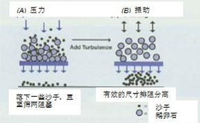 (B) 振動篩網,破壞位于混合物底部的積聚鵝卵石層,使完全分離得以進行;切向流過濾中,進料流的錯流動力學作用,就相當于此例中的振動。