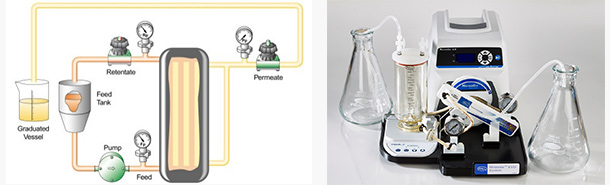 下圖為經典切向流過濾系統的示意圖和實物圖,通常包括泵、膜包和夾具、貯罐、連接管件以及閥門和壓力表等。