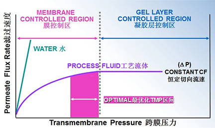 當選擇的跨膜壓處于凝膠層控制區時,通量可以達到最大化,所需的濾膜面積也可達到最小,但此時已經在濾膜表面形成了濃差極化層,此處的溶質濃度可能已經到達了其可溶解的極限,可能因此導致產品收率的下降。此外,濃差極化的后期可能導致堵塞,會引起通量不可逆轉的下降。因此,優化的跨膜壓值應該取在曲線的拐點處和之前。此時,濾膜還未被完全濃差極化,通量值也相對較高。