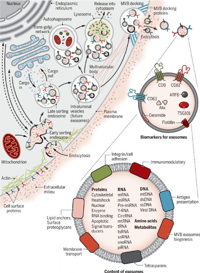 在過去的幾十年中,外泌體因其在改變細胞功能中的作用而受到了廣泛關注。外泌體是膜結合的納米級囊泡,最初通過晚期核內體的內陷形成為特定的腔內囊泡群。由于晚期多泡內體與質膜融合,這些內體來源的腔內囊泡隨后被釋放到細胞外環境中,這是一種將它們與其他類型的細胞外囊泡區分開來的生物發生機制[1]。