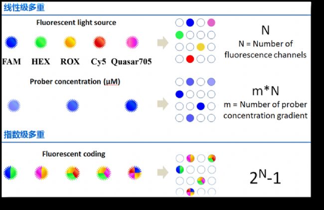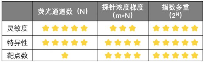 基于熒光通道數(shù)的增加和基于探針濃度梯度增加,均可以在一定程度上提高數(shù)字PCR檢測重?cái)?shù),然而只能達(dá)到“線性”增加的目的。基于探針濃度梯度的多重檢測技術(shù)雖然可以顯著增加多重能力,但由于無法避免cross-reactivity現(xiàn)象,不能確保僅獲得位點(diǎn)特異性的分簇,因此穩(wěn)定性不足、靈敏度較差,難以滿足臨床級別的數(shù)據(jù)要求。而基于創(chuàng)新的且數(shù)字PCR獨(dú)特適用的熒光編碼技術(shù)可以實(shí)現(xiàn)“指數(shù)”級的多重檢測,顛覆性的提高數(shù)字PCR檢測重?cái)?shù),更全面的覆蓋臨床應(yīng)用多場景需求。