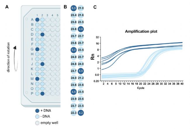 A) 384孔板中純化方案的布局。前兩列是磁珠和細胞裂解物的混合物(+DNA)或磁珠和水的混合物(-DNA)。B) qPCR擴增后獲得的每個孔的循環閾值。C) 表示在擴增周期內每個樣本的Rn值(normalized reporter value)擴增曲線。