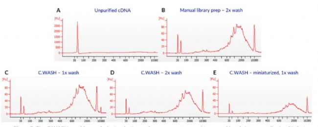 SMART-seq2文庫制備后,分別對未純化的cDNA進行手工清洗和使用C.WASH清洗,然后通過生物分析儀檢測對比結果。