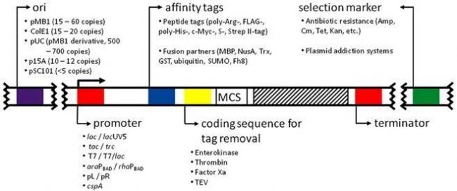 復(fù)制子:包含復(fù)制起始點及相關(guān)順式作用控制元件(cis-acting control elements)。在選擇質(zhì)粒載體時,質(zhì)粒拷貝數(shù)是一個非常重要參數(shù),應(yīng)重點考慮。目前可從市場上購買到的載體非常多,如pET、pUC、pACYC 、pBAD和pSC101等。pET系列載體含有pMB1起始子,在單個菌體中該類質(zhì)粒的拷貝數(shù)通常為15-60;pUC系列含有一個突變的pMB1起始子,在該系列的載體在單個細菌中的拷貝數(shù)通常為500–700;pACYC和pBAD系列常被用于雙表達體系,如FRET系統(tǒng),該系列含有p15A起始子,單個細胞中質(zhì)粒的拷貝數(shù)為10-12;pSC101系列載體在單個細胞中的拷貝數(shù)較少,通常<5個,此類載體常被用于三種蛋白的共表達。