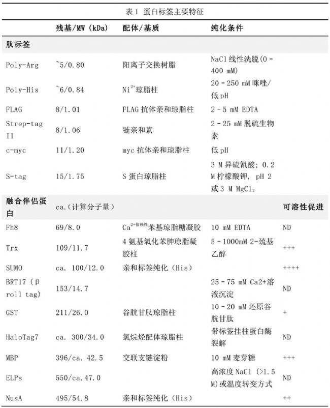 融合標簽:為了使蛋白的下游純化過程更加容易以及促進某些不溶性蛋白可溶表達,通常在表達目標蛋白的N端或C端會加入融合標簽。融合標簽可分兩類:一類是短肽類標簽;一類是長肽類標簽,主要以融合蛋白(fused partner)形式共表達。短肽標簽主要作用是使蛋白下游純化更加快捷高效,長肽類標簽更多的作用是促進蛋白可溶性表達;短肽類標簽一般只含幾個氨基酸,分子量一般小于2 kDa,對重組蛋白的性質(zhì)影響較小。親和標簽可以放置在蛋白的C-端或N-端,如需要表達分泌性蛋白,一般放置于C-端,信號肽通常放置于N-端。不同的蛋白標簽需要根據(jù)具體案例來分析,常用的蛋白標簽性質(zhì),如下表所示