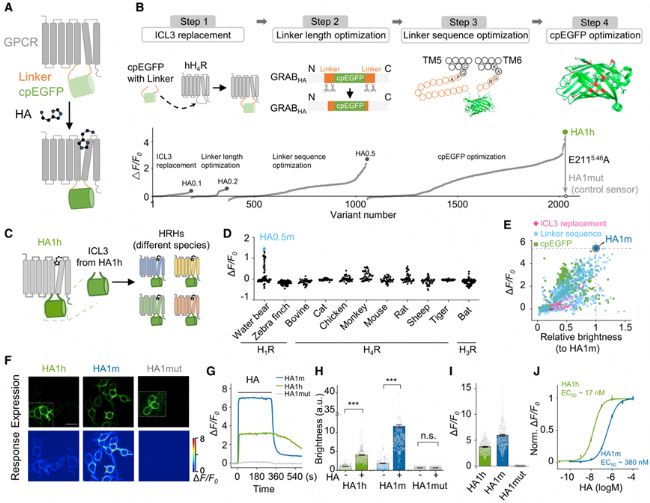 盡管組胺在體內的生理和病理過程中發揮著重要作用,但是由于現有檢測方法的局限性,已有的研究對于組胺在各種行為過程中釋放的時空動力學仍然知之甚少。近年來,基于GRAB策略(GPCR-Activation Based Sensor),作者團隊已經成功開發了一系列具有高靈敏度、高選擇性和高時空分辨率的基因編碼的分子探針,用于檢測體內各種神經遞質或神經調質的精細變化情況。沿用這一策略,在本研究中,作者基于人源H4R組胺受體和水熊蟲H1R組胺受體,分別開發出一對能夠精細測量細胞外組胺的基因編碼的熒光探針GRABHA1h和GRABHA1m。該探針具有高度的特異性(只對組胺響應,并可被相應拮抗劑阻斷),快速的動力學(亞秒量級)、以及顯著的熒光信號響應(ΔF/F0: ~300%-500%)。