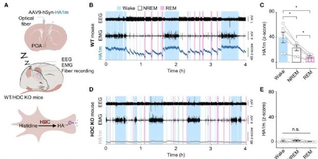 為了驗證上述開發探針是否可以檢測內源組胺的釋放,作者首先在小鼠急性腦片中進行了測試。在前額葉皮層(prefrontal cortex, PFC)表達了GRABHA1m探針的急性腦切片中,作者成功地記錄到電刺激引起的組胺的秒級實時釋放以及擴散,表明該探針可以高時空分辨率的檢測內源組胺的釋放。隨后,作者進一步將該探針應用到活體動物中用于監測睡眠相關的組胺動態變化。結合腦電肌電記錄,作者觀察到小鼠在快速眼動睡眠(REM)或非快速眼動睡眠(NREM)向覺醒轉換過程中,視前區(preoptic area, POA)組胺信號升高;在覺醒向NREM轉換和NREM向REM轉換過程中,POA組胺信號下降。并且,作者還觀察到:在同一睡眠時相,不同睡眠調控腦區(PFC和POA)組胺信號的大小是一致的;但是在睡眠時相轉換時,不同腦區組胺信號的動力學存在差異,提示組胺信號的調節在不同腦區存在差異。
