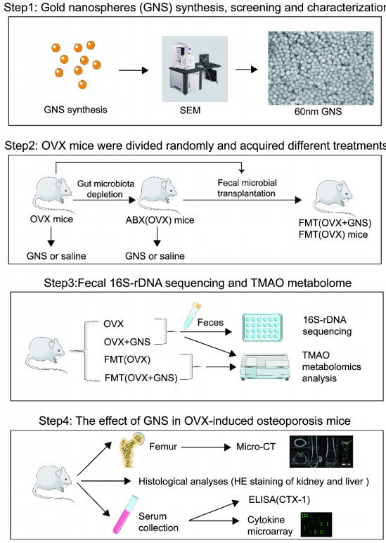 骨質(zhì)疏松癥(Osteoporosis, OP)是一種代謝性骨病,其特征是骨量減少和骨脆性增加。金納米球(Gold nanospheres, GNS)作為一種常見的金納米顆粒,具有顯著的抗菌抗炎活性,已被應(yīng)用于治療眼疾病和類風(fēng)濕性關(guān)節(jié)炎。然而,GNS對骨質(zhì)疏松癥的影響仍不明確。有研究表明腸道微生物群可能參與調(diào)節(jié)骨代謝和骨質(zhì)疏松癥的進(jìn)展,且氧化三甲胺(Trimethylamine N-oxide, TMAO)參與了骨骼健康的維持,但其潛在機(jī)制尚不清楚。卵巢切除術(shù)(ovariectomy, OVX)誘導(dǎo)的小鼠骨質(zhì)疏松癥模型已被廣泛用于模擬骨質(zhì)疏松癥的典型臨床表型,因此本研究采用OVX骨質(zhì)疏松小鼠來研究GNS是否對骨質(zhì)疏松癥有治療作用。作者結(jié)合腸道微生物測序和氧化三甲胺的檢測,證明了GNS作為腸道微生物群調(diào)節(jié)劑對骨質(zhì)疏松癥有保護(hù)作用,并為“腸-骨”軸的調(diào)節(jié)提供了新的見解。