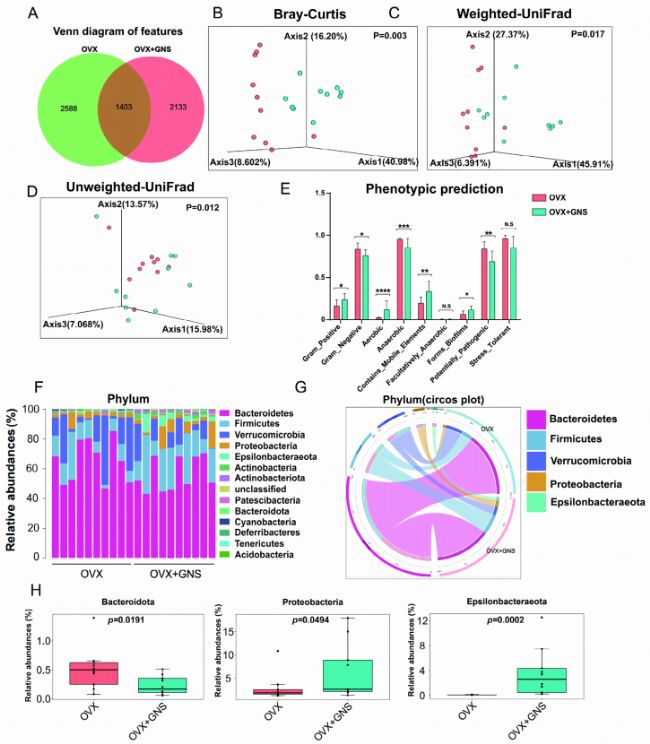 進(jìn)一步使用糞便中細(xì)菌的16S r測序分析研究了GNS對腸道微生物群多樣性和組成的調(diào)節(jié)作用。如圖5A所示,OVX和OVX+GNS組的糞便中共獲得6124個(gè)菌,其中1403個(gè)菌在兩組中共有。通過主坐標(biāo)分析(PCoA)顯示,兩組之間明顯分離,表明OVX+GNS和OVX組的微生物群組成不同(圖5 B-D)。