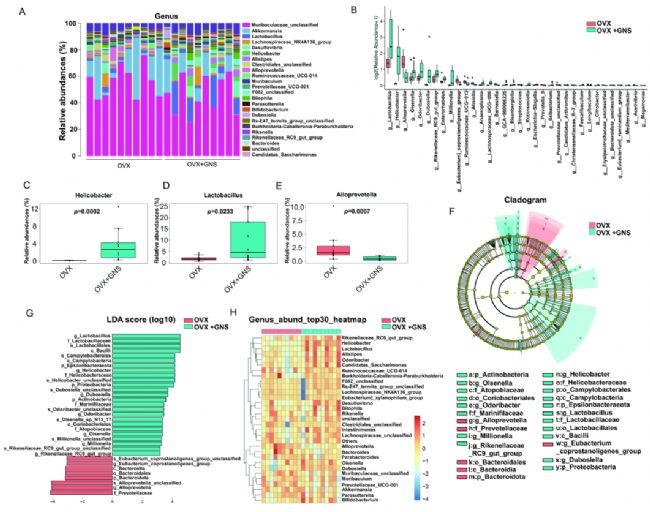 為了研究兩組之間腸道微生物群的具體變化,在不同水平上評估了每組分類群的相對豐度。如圖5F和5G所示,擬桿菌門和厚壁菌門為兩大優(yōu)勢門,有趣的是,OVX+GNS組中厚壁菌門與擬桿菌門的比例顯著高于OVX組,表明擬桿菌門對GNS的敏感性更高。此外,GNS給藥顯著降低了擬桿菌門的水平,但增加了變形菌門和ℇ變形菌門的水平(圖5 H)。